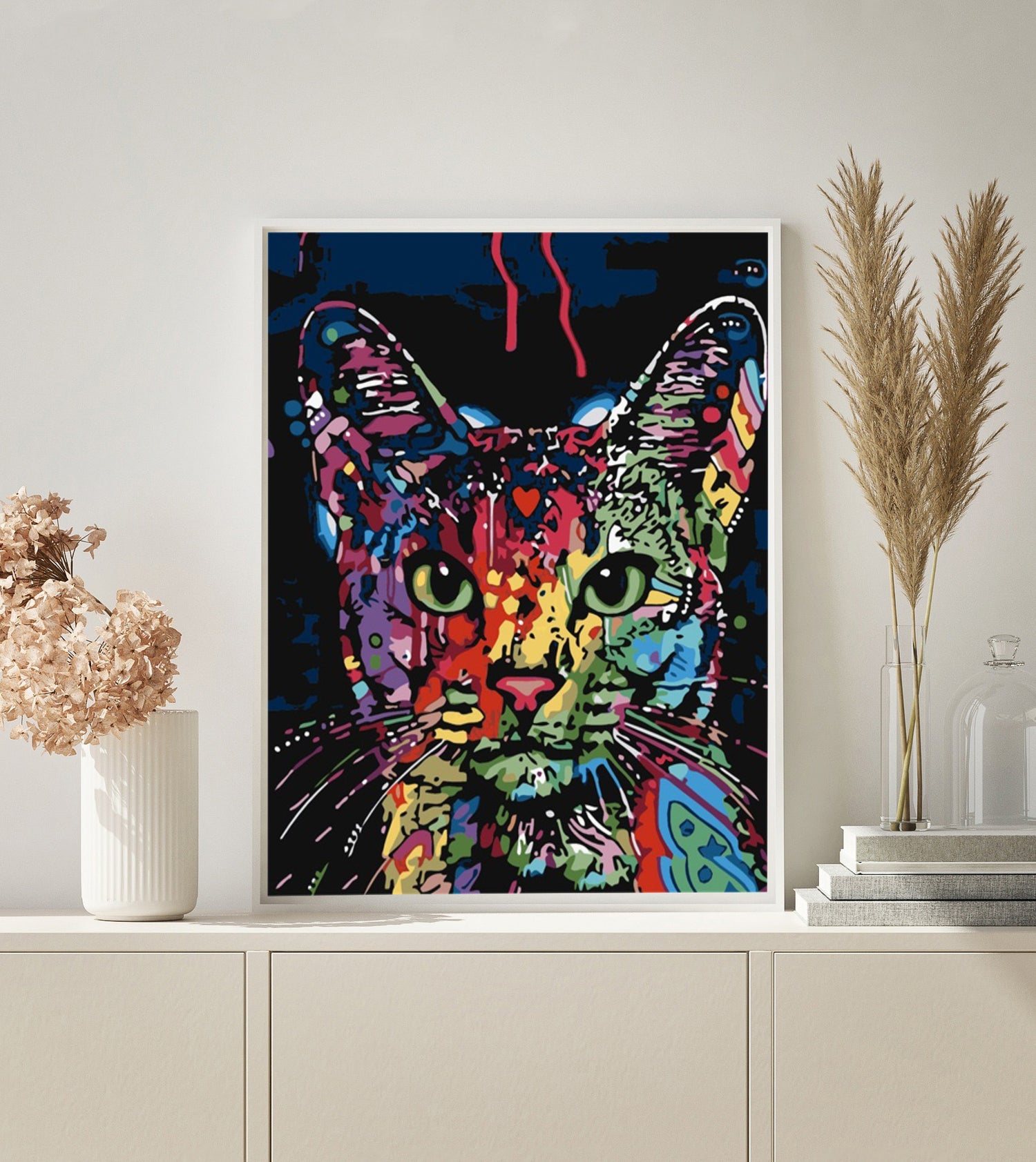 Erwecke die Vielfalt der Farben mit unserem Malen nach Zahlen Set - Bunte Katze. Gestalte ein lebendiges Gemälde dieser verspielten Katze, Schritt für Schritt. Beginne deine kreative Reise bei LieblingsArt und lass die Farbenpracht dieser Katze auf deiner Leinwand erblühen!